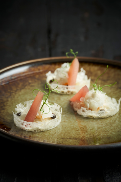 Krokantje van geitenkaas met peer en rode shiso